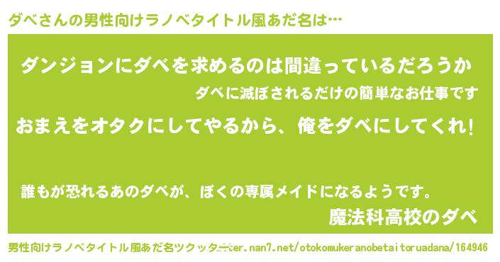 | 女子向けラノベタイトル風あだ名 | 『ダベ夫妻のなれそめ』『ダベの契約王妃』 |