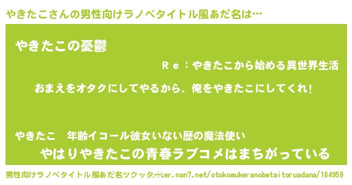| 女子向けラノベタイトル風あだ名 | 『やきたこ恋絵巻』『闇のやきたこ』 |