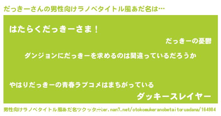 | 女子向けラノベタイトル風あだ名 | 『だっきーの卵を拾いまして』 |