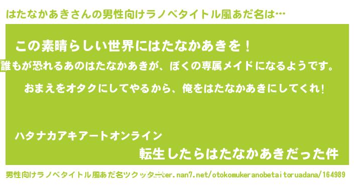 | 女子向けラノベタイトル風あだ名 | 『はたなかあき夫妻のなれそめ』 |
