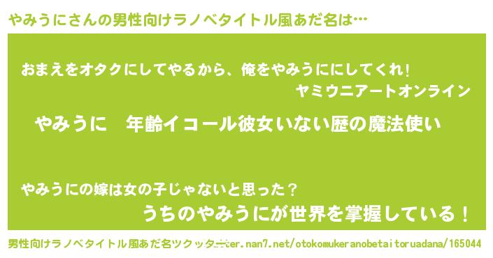 | 女子向けラノベタイトル風あだ名 | 『やみうにの玉の輿計画!』 |