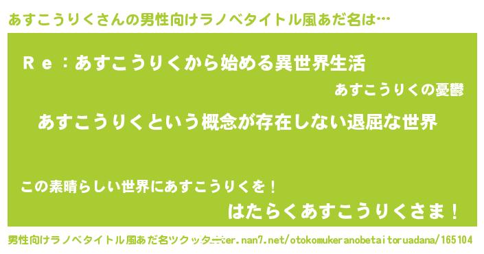 | 胡散臭い通販商品みたいなあだ名 | 『来世でも幸せになれる水素水…その名も「あすこうりく」』 |