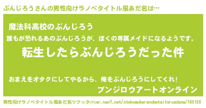 | 女子向けラノベタイトル風あだ名 | 『ぶんじろうの玉の輿計画!』 |