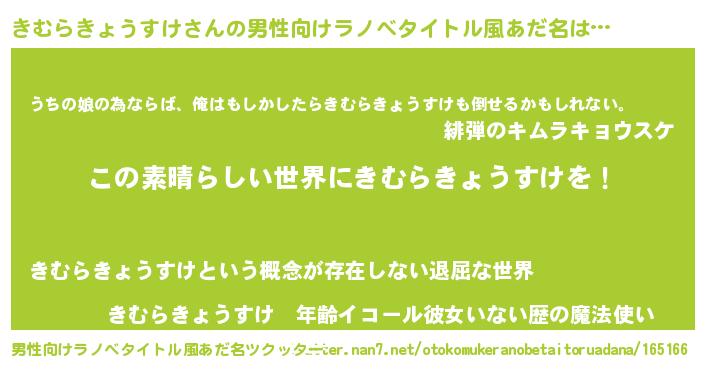 女子向けラノベタイトル風あだ名 | 『乙女ゲームの破滅フラグしかない悪役きむらきょうすけに転生してしまった…』 |