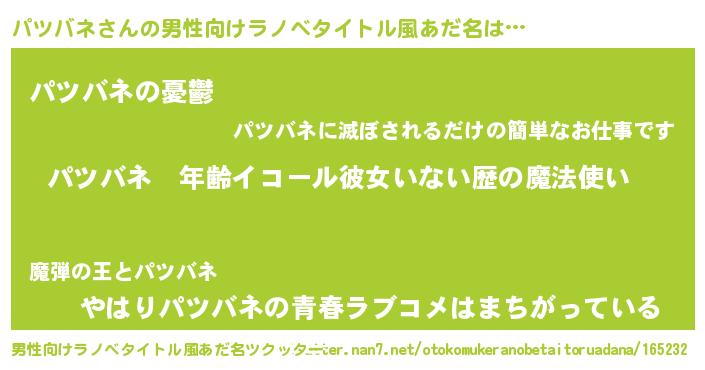 | 女子向けラノベタイトル風あだ名 | 『パツバネの玉の輿計画!』 |