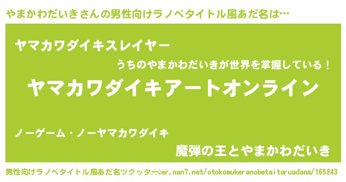 | 女子向けラノベタイトル風あだ名 | 『誰かこのやまかわだいきを説明してください! ~契約から始まるウェディング~』 |
