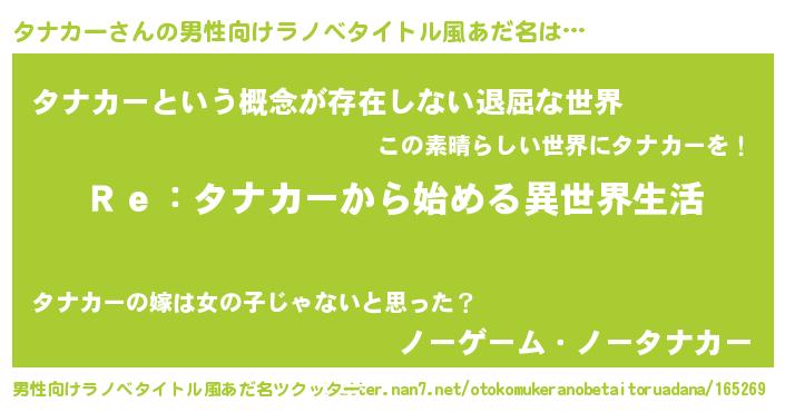 | 女子向けラノベタイトル風あだ名 | 『闇のタナカー』『死神タナカーの再婚』 |