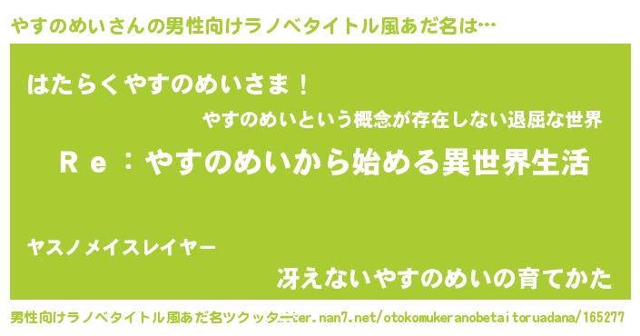 | 女子向けラノベタイトル風あだ名 | 『やすのめいストレイドッグス』 |