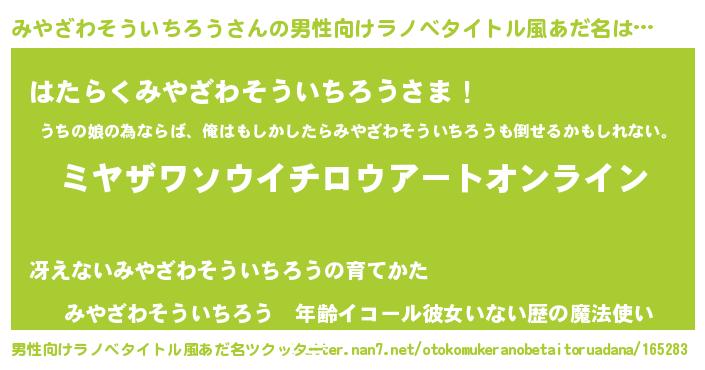 | 胡散臭い通販商品みたいなあだ名 | 『モテモテ間違いなし霊験あらたかなお札…その名も「みやざわそういちろう」』 |