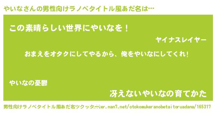 | 女子向けラノベタイトル風あだ名 | 『やいな夫妻のなれそめ』 |