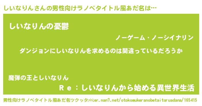 | 女子向けラノベタイトル風あだ名 | 『しいなりんの卵を拾いまして』 |