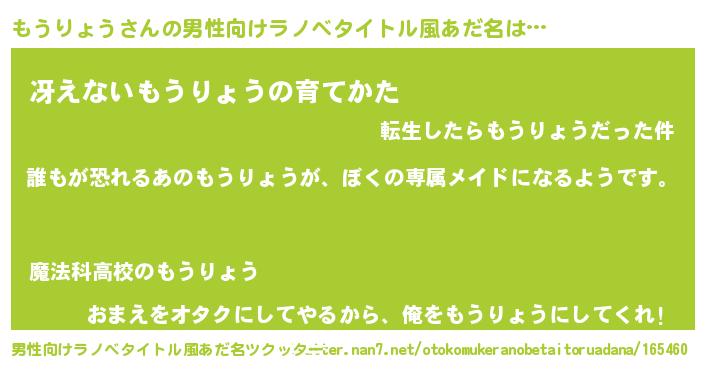 | 女子向けラノベタイトル風あだ名 | 『異世界でカフェもうりょうを開店しました。』 |