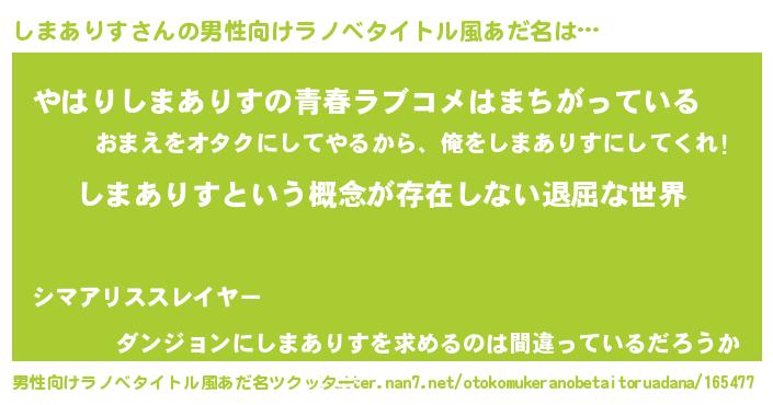 | 胡散臭い通販商品みたいなあだ名 | 『絶対に幸福をもたらす健康食品…その名も「しまありす」』 |