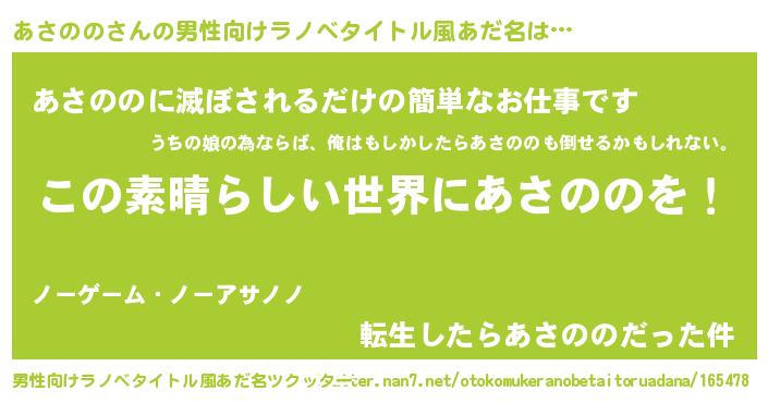 | 女子向けラノベタイトル風あだ名 | 『悪役あさののに転生したようですが、知った事ではありません』 |