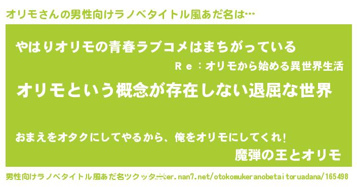 | 胡散臭い通販商品みたいなあだ名 | 『絶対に幸福をもたらす水素水…その名も「オリモ」』 |