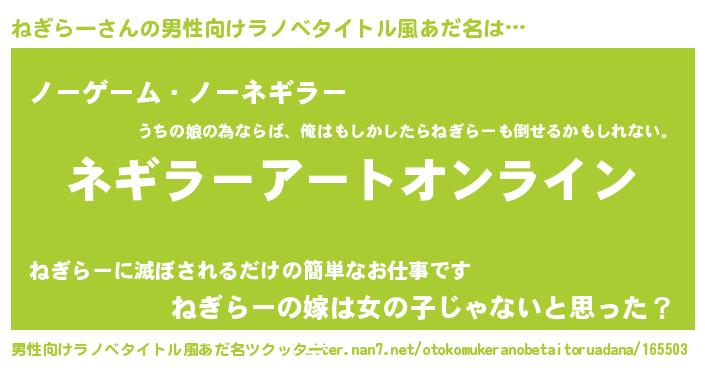 | 女子向けラノベタイトル風あだ名 | 『誰かこのねぎらーを説明してください! ~契約から始まるウェディング~』 |