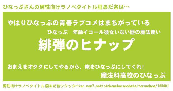 | 女子向けラノベタイトル風あだ名 | 『シンデレラひなっぷ家の靴箱館』 |