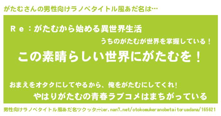 | ヒーロー風カッコイイあだ名 | 『仮面ガタダー』『最強戦士ガタム』 |