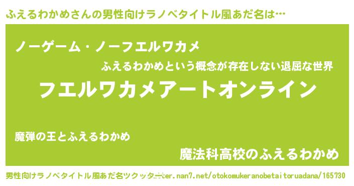 | 女子向けラノベタイトル風あだ名 | 『誰かこのふえるわかめを説明してください! ~契約から始まるウェディング~』 |