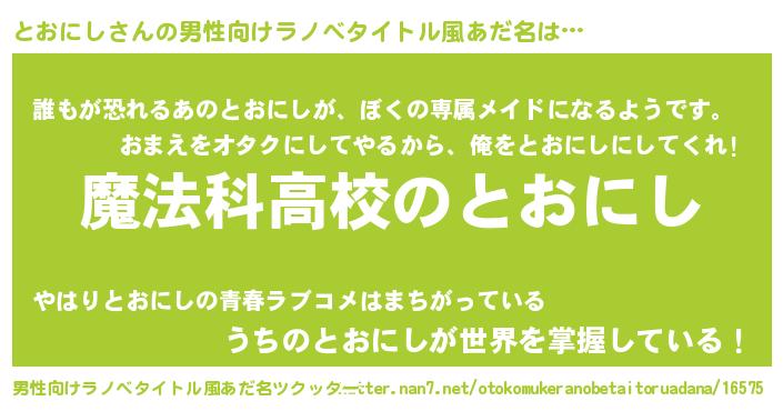 | 女子向けラノベタイトル風あだ名 | 『とおにしなんてお断りですっ。』 |