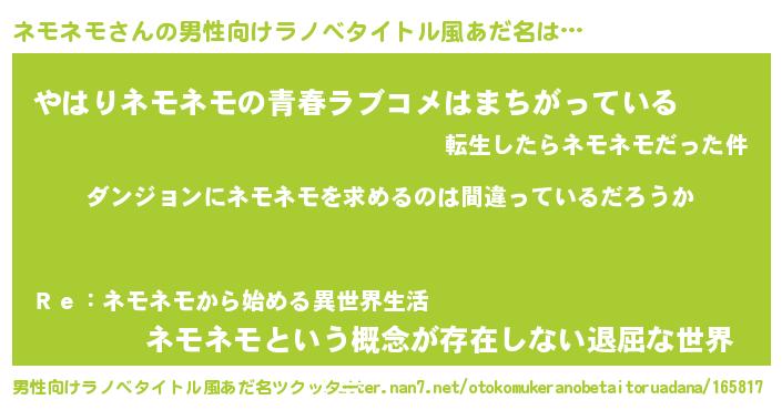 | ヘコむあだ名 | 『ネモぷりん』『豆乳』『ネモにゅー』 |