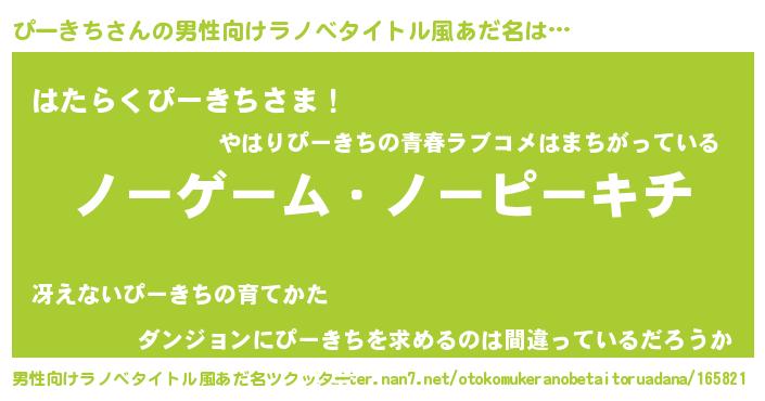 | 女子向けラノベタイトル風あだ名 | 『死神ぴーきちの再婚』 |
