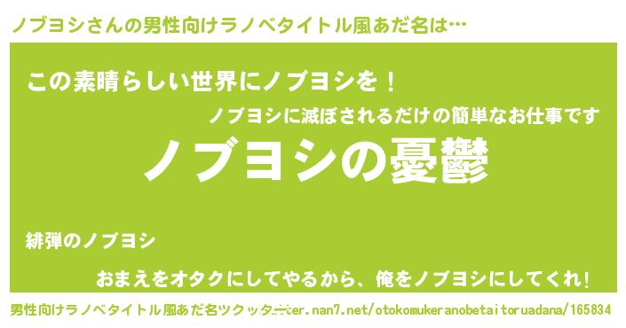 | 女子向けラノベタイトル風あだ名 | 『(仮)ノブヨシのやんごとなき事情』 |
