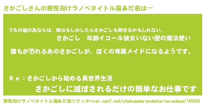 | 女子向けラノベタイトル風あだ名 | 『異世界でカフェさかごしを開店しました。』 |