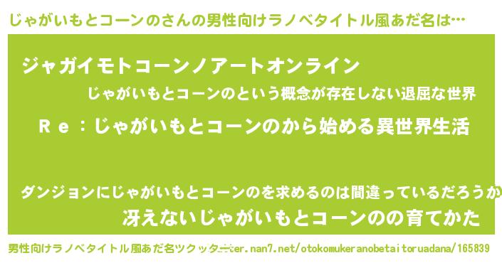 | 意味不明あだ名 | 『自称じゃがいもとコーンの』 |