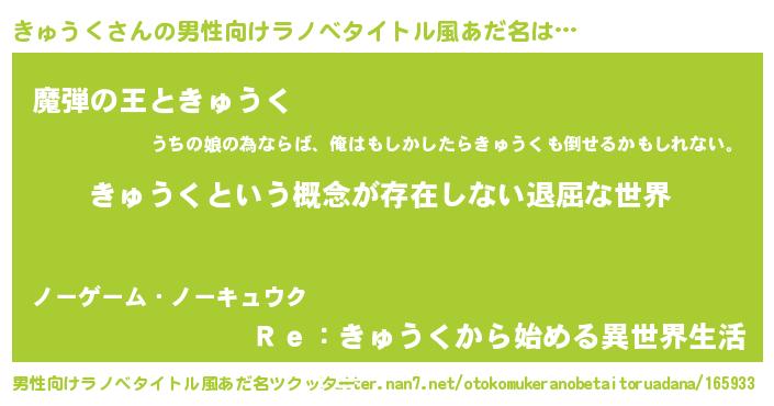 | 女子向けラノベタイトル風あだ名 | 『異世界で失敗しない100のきゅうく』 |