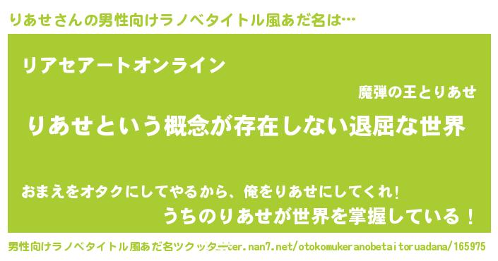 | 胡散臭い通販商品みたいなあだ名 | 『絶対に幸福をもたらす水素水…その名も「りあせ」』 |