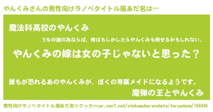 | 女子向けラノベタイトル風あだ名 | 『やんくみの卵を拾いまして』 |