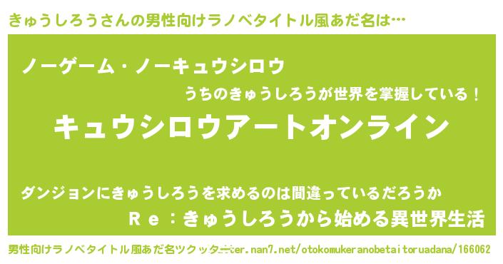 | 女子向けラノベタイトル風あだ名 | 『誰かこのきゅうしろうを説明してください! ~契約から始まるウェディング~』 |