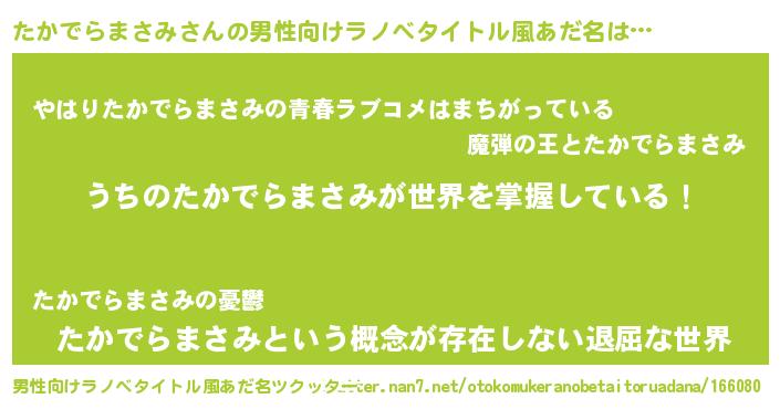 | 女子向けラノベタイトル風あだ名 | 『男装たかでらまさみの憂鬱な任務』 |