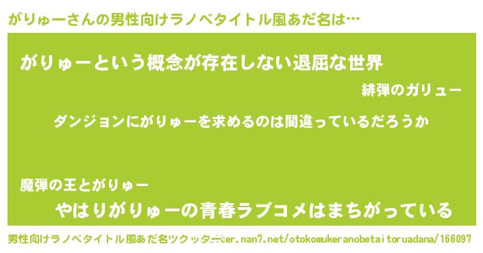 | 胡散臭い通販商品みたいなあだ名 | 『信頼と実績のサプリメント…その名も「がりゅー」』 |