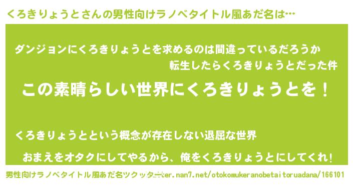 | 胡散臭い通販商品みたいなあだ名 | 『あなたにだけ特別に提供する世界で10本だけ現存している希少なブランデー…その名も「くろきりょうと」』 |