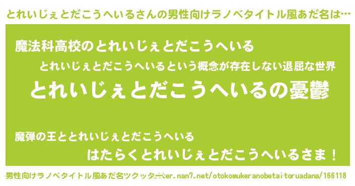 とれいじぇとだこうへいるさんの男性向けラノベタイトル風あだ名をツクッター!