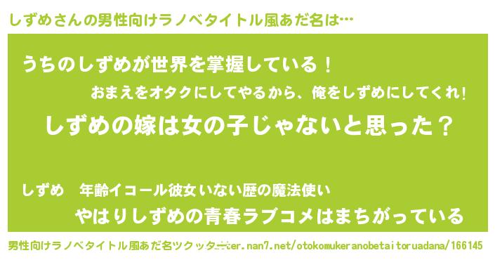 | 女子向けラノベタイトル風あだ名 | 『しずめ様がみてる』 |