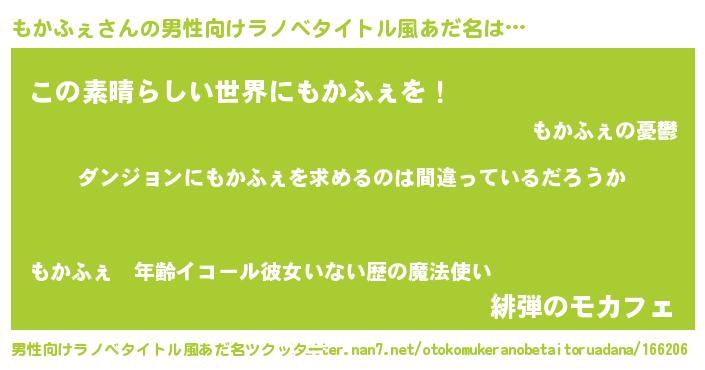 | 女子向けラノベタイトル風あだ名 | 『もかふぇの卵を拾いまして』 |
