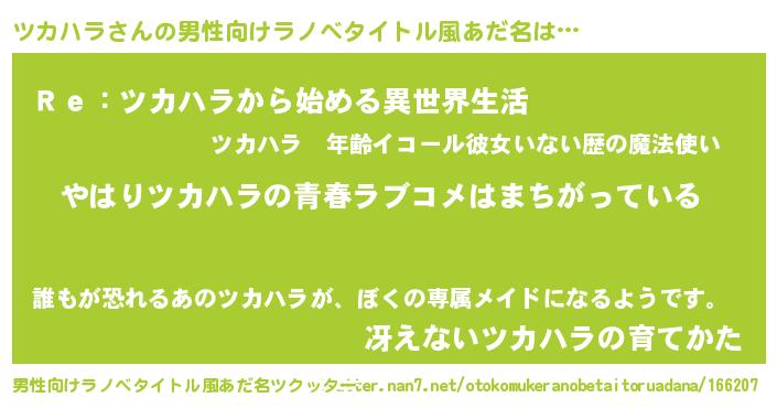 | 女子向けラノベタイトル風あだ名 | 『ツカハラの雑貨屋さん』『闇のツカハラ』 |