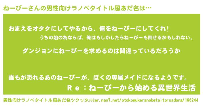 | 女子向けラノベタイトル風あだ名 | 『ねーぴーの卵を拾いまして』 |