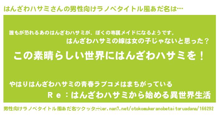 | 意味不明あだ名 | 『住所不定無職はんざわハサミ(7歳)』 |