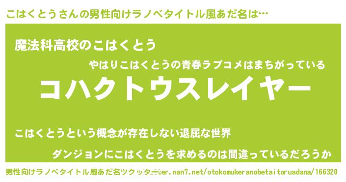 | ヒーロー風カッコイイあだ名 | 『超時空戦士コハクトウ』『銀牙騎士コハ』 |