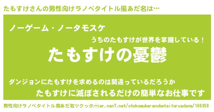 | 女子向けラノベタイトル風あだ名 | 『(仮)たもすけのやんごとなき事情』 |