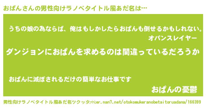 | 女子向けラノベタイトル風あだ名 | 『おぱんは平凡を望む』『おぱんの婚約者』 |