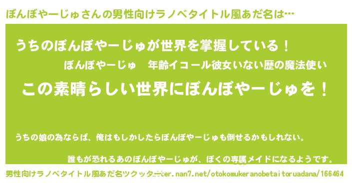 | 胡散臭い通販商品みたいなあだ名 | 『あなたにだけ特別に提供する100年もののヴィンテージワイン…その名も「ぼんぼやーじゅ」』 |