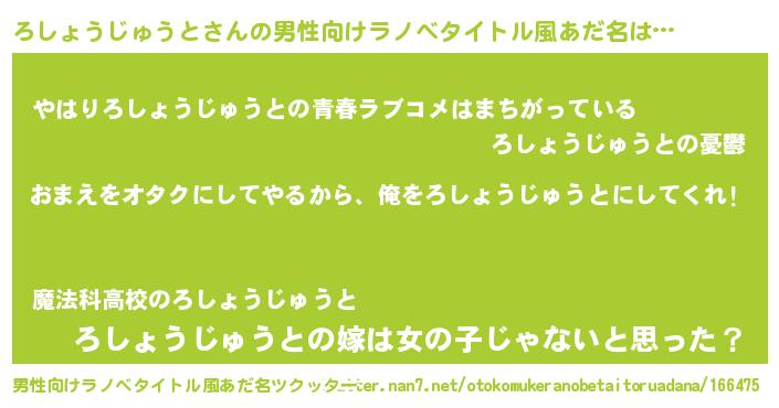| 女子向けラノベタイトル風あだ名 | 『ろしょうじゅうと夫妻のなれそめ』 |