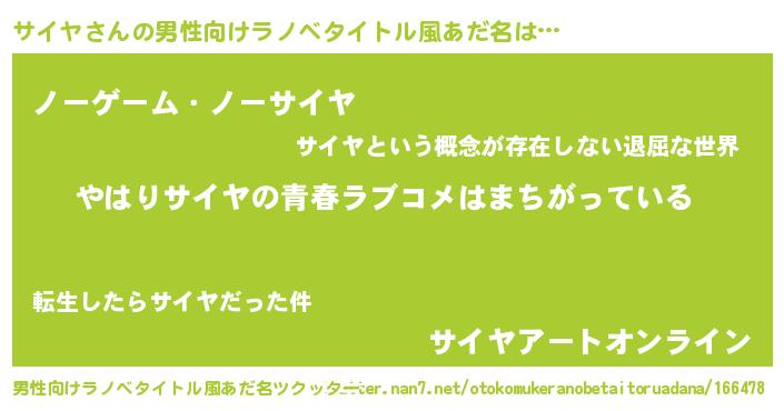 | 女子向けラノベタイトル風あだ名 | 『サイヤの雑貨屋さん』 |