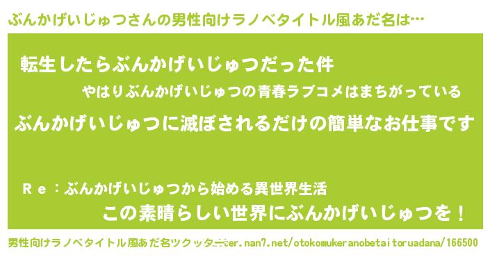 | 胡散臭い通販商品みたいなあだ名 | 『あなたにだけ特別に提供する100年もののヴィンテージワイン…その名も「ぶんかげいじゅつ」』 |