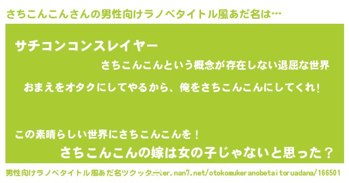 | 女子向けラノベタイトル風あだ名 | 『さちこんこん夫妻のなれそめ』 |